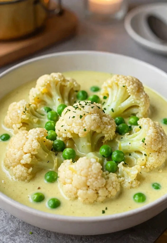 2. Stir in cauliflower florets, peas, and coconut milk; bring to a simmer.