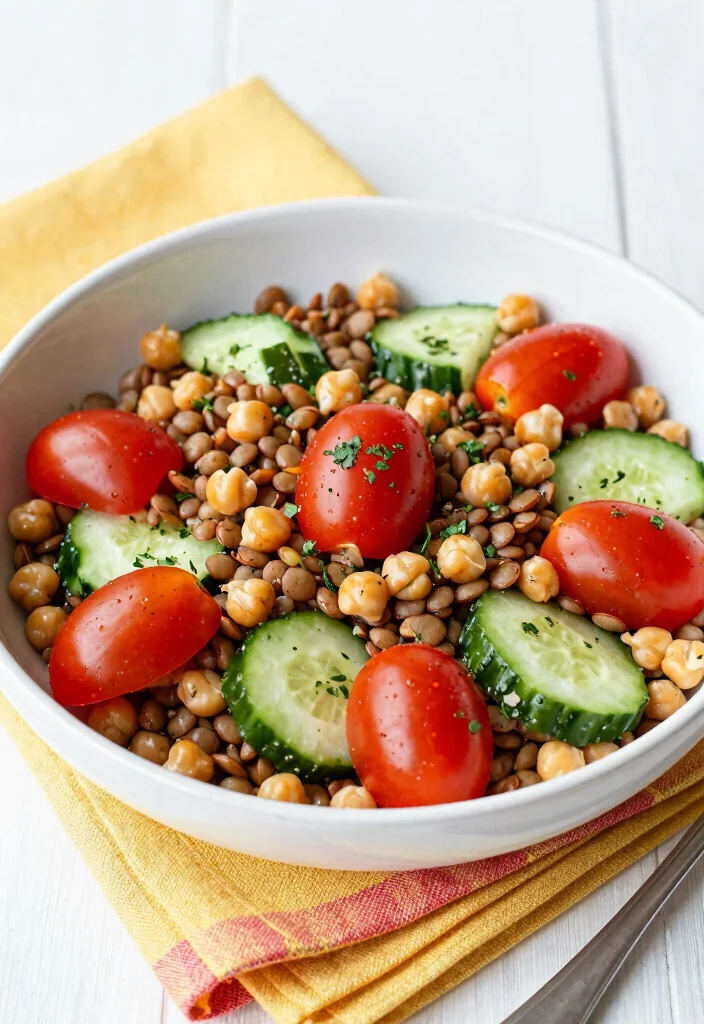 The mix of lentils and chickpeas creates a hearty texture, while fresh veggies and a tangy dressing add brightness. It’s a refreshing salad that’s easy to whip up and perfect for any occasion.