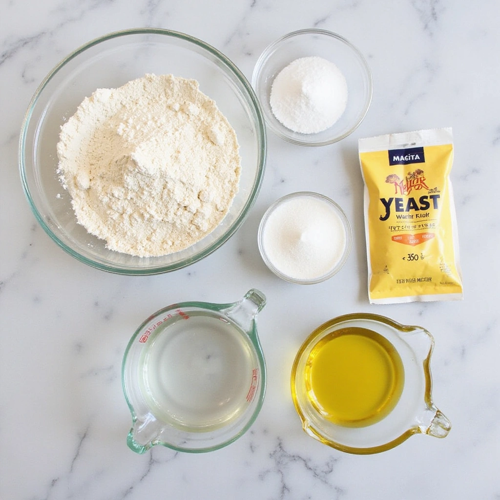 Measure out the flour, salt, sugar, yeast, and olive oil accurately.